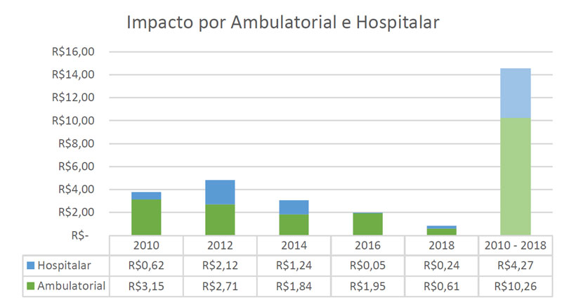 Em suma, no acumulado das 5 atualizações do Rol, os procedimentos ambulatoriais representaram um aumento de R$ 10,26 enquanto os procedimentos hospitalares representaram um aumento de R$ 4,27.